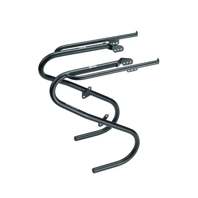 Porte-bagages avant en acier CroMo dont la conception permet de se passer d’un étrier de renforcement au-dessus de la roue avant.